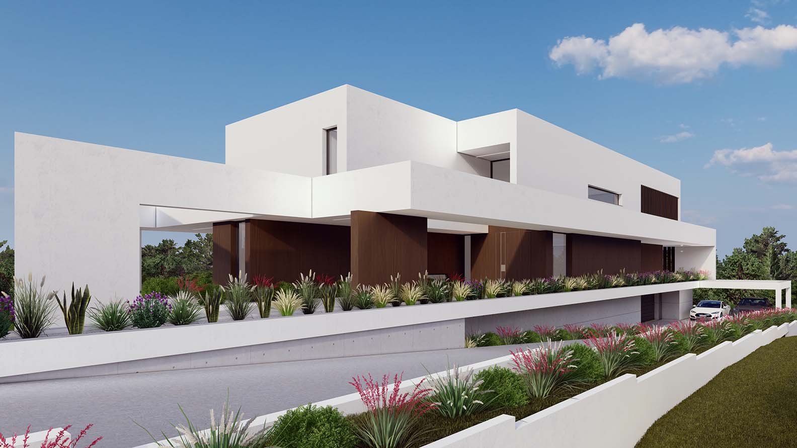 Volumetria simples, caracterizada pelos seus volumes brancos e zonas recuadas em madeira, com a presença de muito vidro e transparência.